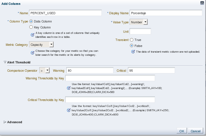 - Acá se debe seleccionar la Columna del query que nos va a dar el valor a evaluar, Nombre a mostrar, decir si es una columna de información (por ejemplo el nombre del tablespace), o si es una de datos (los valores que quiero evaluar) y características. → OK