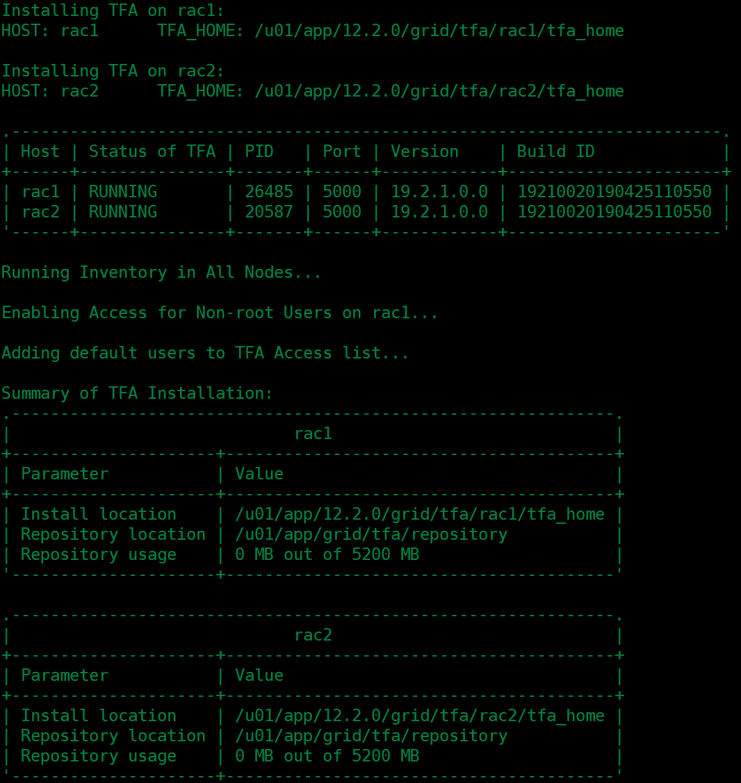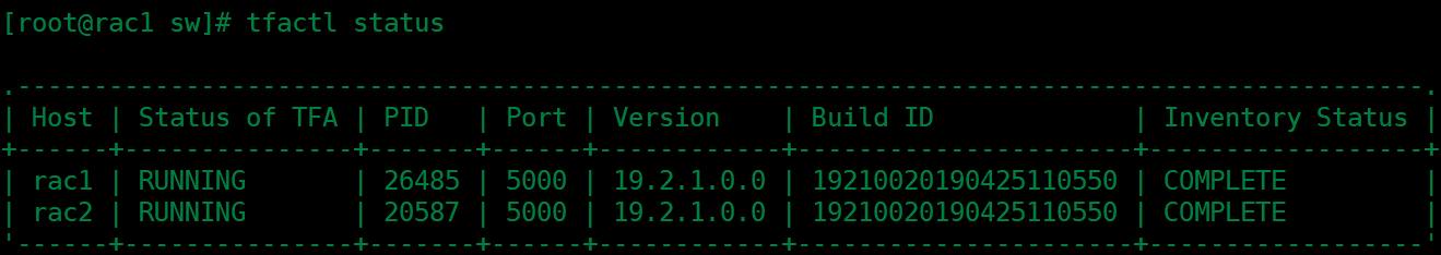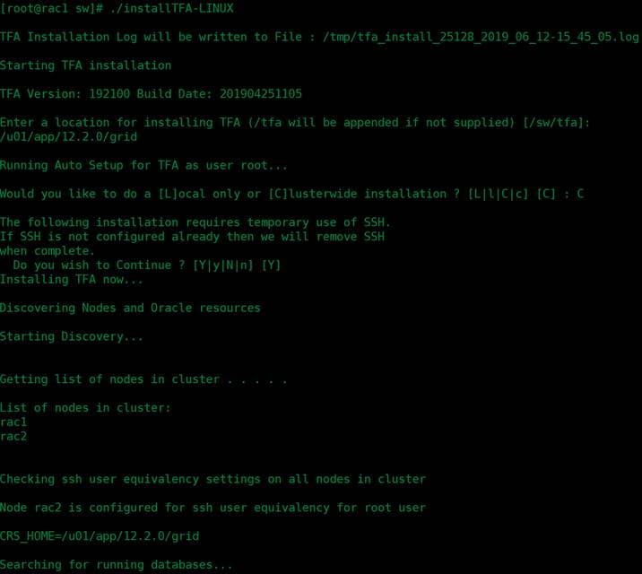 [root@rac1 ~]# cd /sw [root@rac1 sw]# unzip TFA-LINUX_v19.2.1 Archive: TFA-LINUX_v19.2.1 inflating: README.txt inflating: installTFA-LINUX